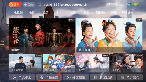 1、橙子TV主页界面中,点击最下方的“个性主题”点击来到详细的主题中。