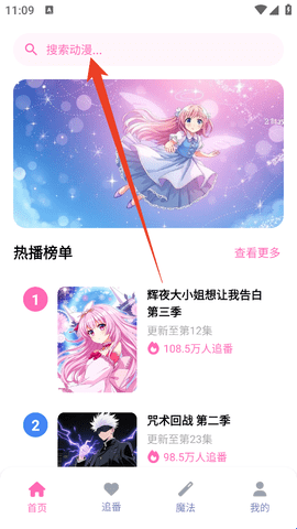 1、进入软件首页后在这里搜索你想看的动漫,直接输入动漫名,或者关键字。