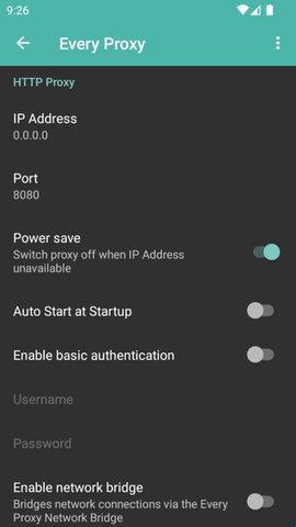 Every Proxy中文版支持账号密码验证,防止陌生人蹭网;可自定义端口、IP绑定,支持深色模式。