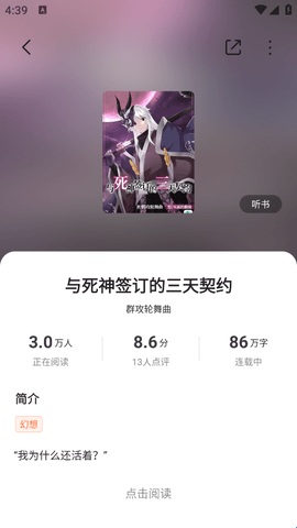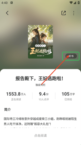用户可以先随意选择一部小说作品,在介绍界面中会有一个“听书”功能。