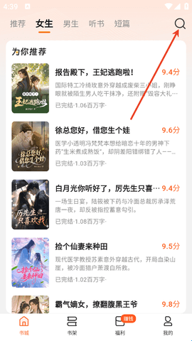 1、围炉小说首页中,拥有多个小说内容,可以根据封面选择,点击“搜索”按钮。