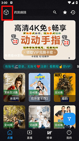 2、点击左上角的小方块,是收集多个影视的位置,这里提供了不同的源。