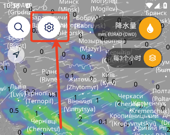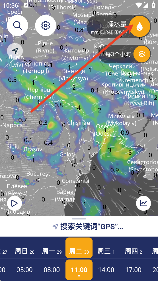 1、点击右上方的水滴图标,可以直接一键切换用户想要查看的气候类型如温度、体感温度、降水量、天气雷达、卫星、云量、风速、阵风、气压、雷暴、海、湿度、积雪层等等。