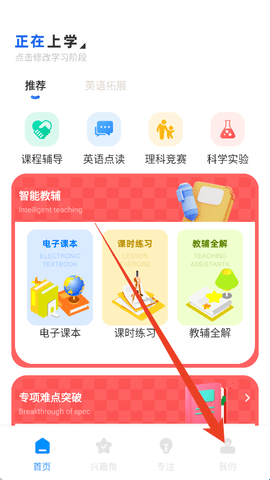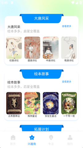 1、需要看教学视频的同学可以直接来到“兴趣角”界面,然后选择当前要学习的版块。