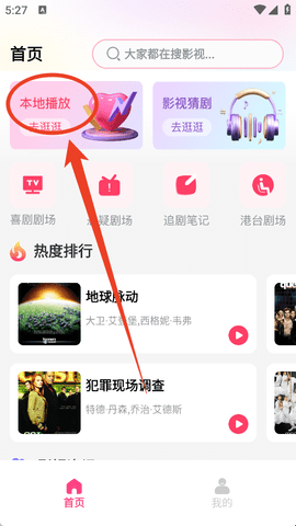 1、需要播放视频的朋友可以点击首页这里的“本地播放”。