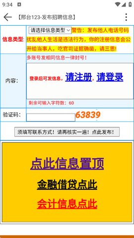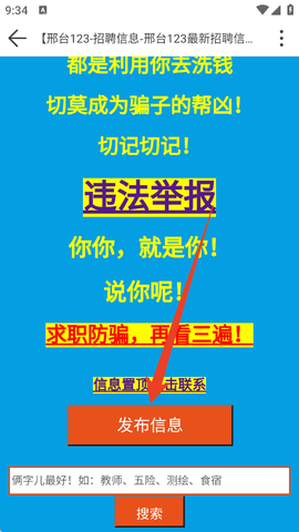 1、大家进入到“邢台123招聘信息栏”后,往下滑动屏幕,就能找到【发布信息】的按钮,点一下进入。