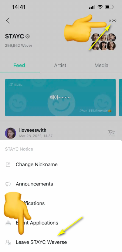 答:在个人主页,点击右上角的三个“。。。”,然后选择【Leave STAYC Weverse】就可以取消订阅了。