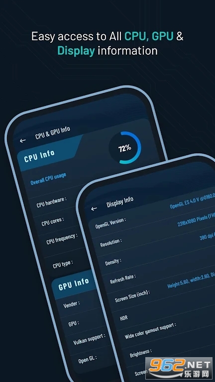 - 查看OpenGL版本、分辨率、密度、刷新率等信息。