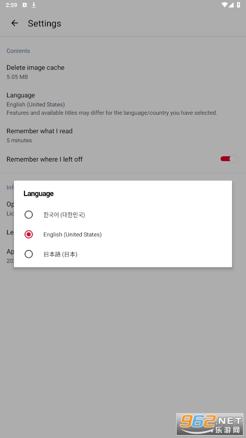 2、lezhin软件没办法设置中文,点击左上角的目录,settings—language里面,只有英文、日语、韩语的选择。