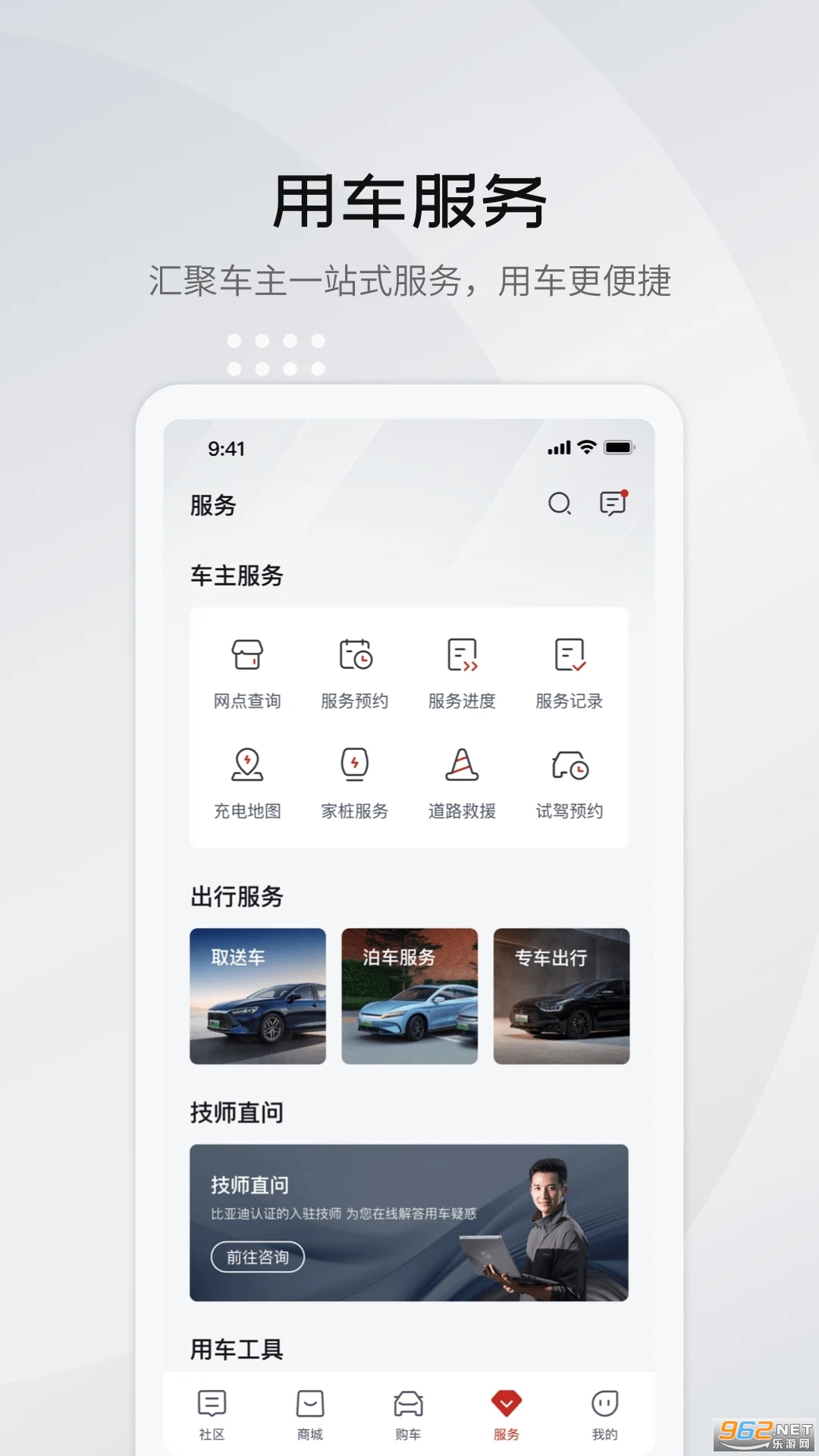 -用车服务:提供网点查询、电桩查询、服务预约、道路救援、机场泊车、取送车等一站式服务。