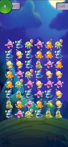 3、多种卡通怪物元素,玩家通过交换相邻怪物的位置,达到三个或三个以上相同怪物相连即可消除得分。