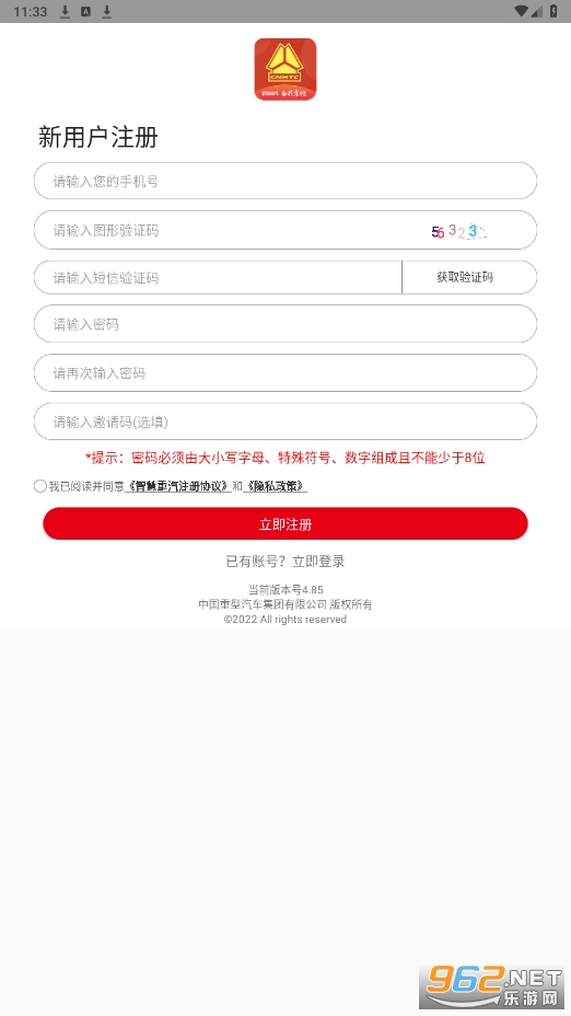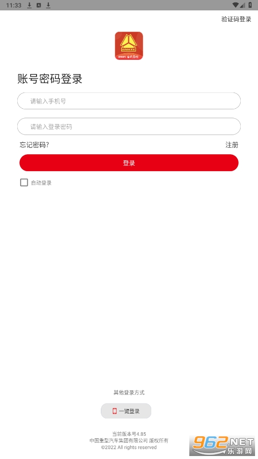 ①老客户进入智慧重汽登录页,输入手机号+密码或手机号+验证码登陆。