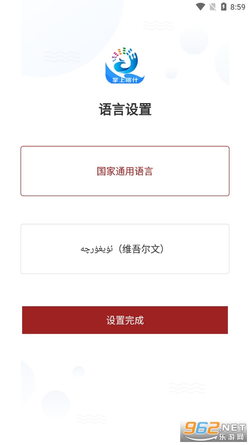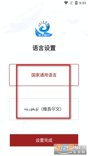2、初次进入软件可以设置语言,有国家通用语言和维吾尔文,选择后点设置完成。