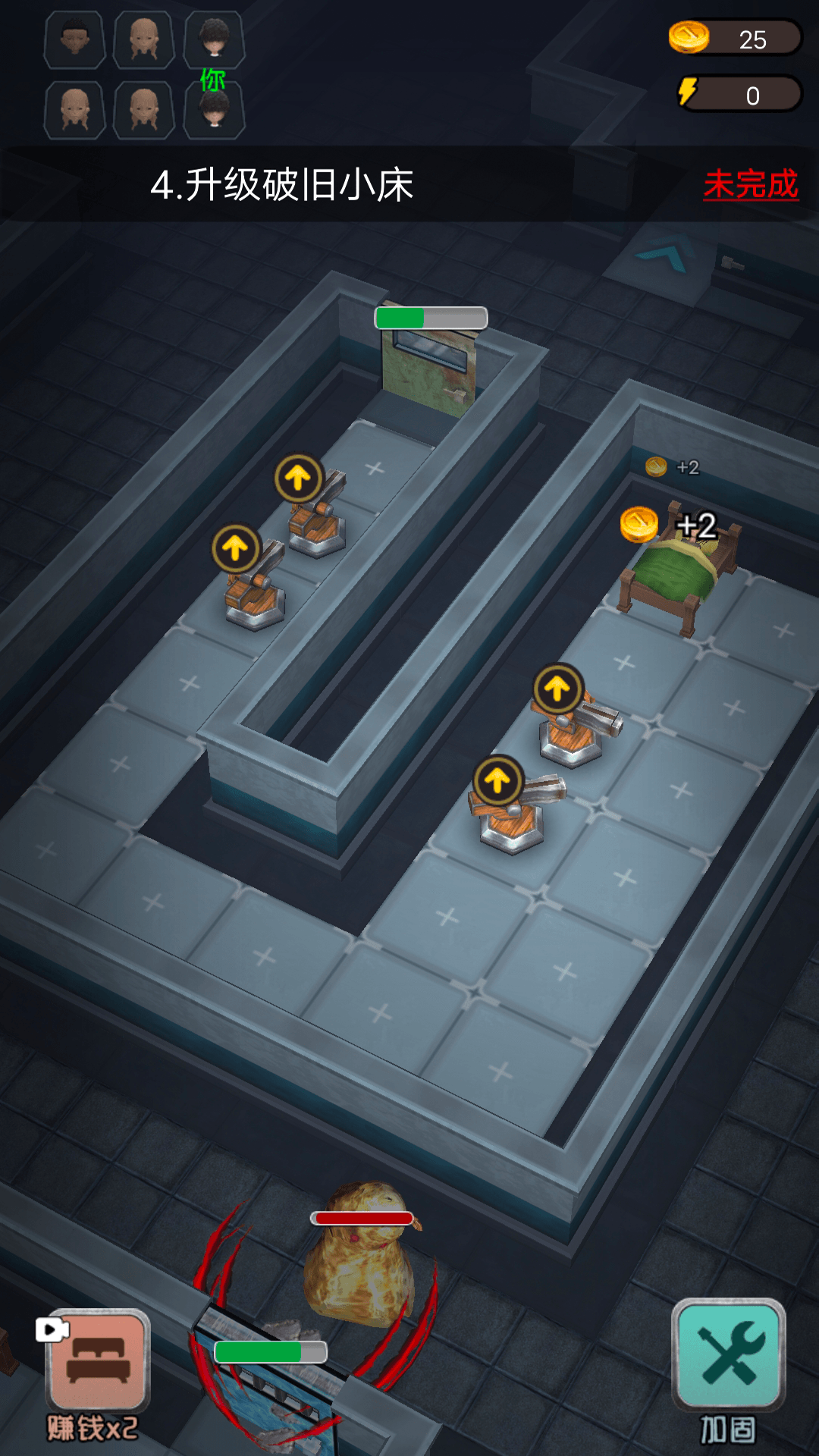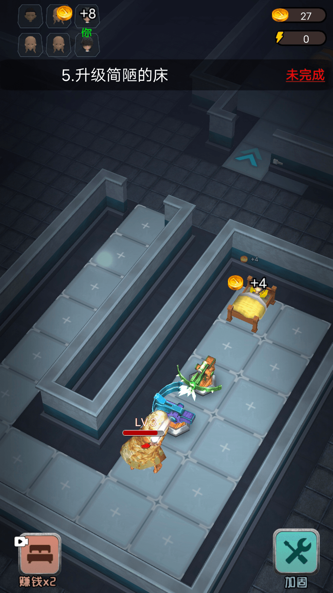 安卓在《躺平发育3D》这款游戏中,玩家将会和自己的队友一起在一个大房子内。我们需要尽快的找到自己的房间并且躺在床上睡觉,我们可以通过睡觉获得游戏中的金币,然后使用金币来升级自己的床获得更多的金币,或者购买武器进行防御,当有鬼来我们房间时可以将它打跑或者消灭。