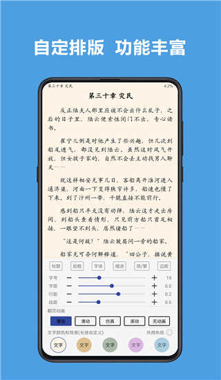 支持高度自定义阅读界面,切换字体、颜色、背景、行距、段距、加粗、简繁转换等。