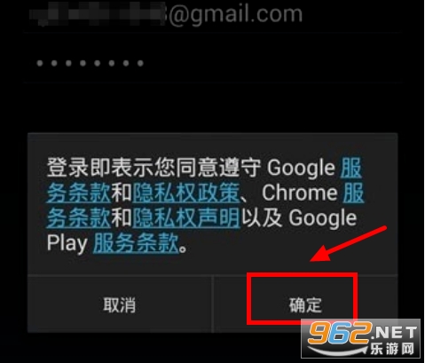 7、输入Google帐户名和密码之后,登录时将会弹出“服务条款”,点击“确定”即可。