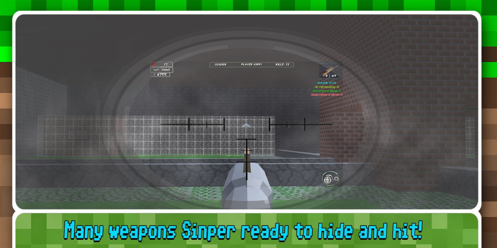 3、方块人僵尸末日生存中体验精彩的冒险在狙击手,做更多的测试,解锁更多的地图。