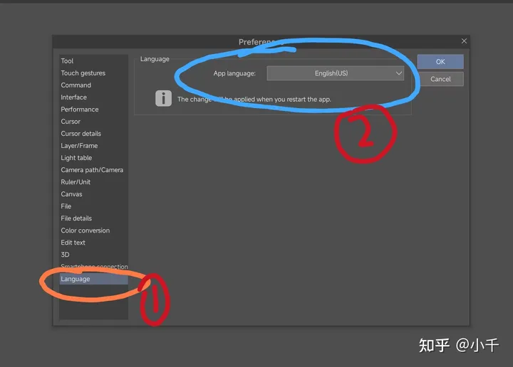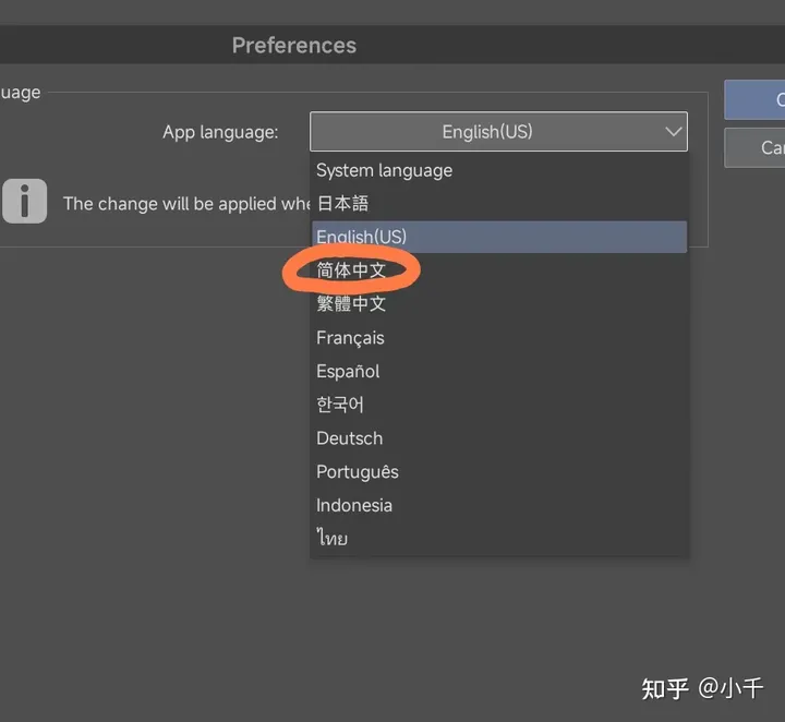 4.在下拉框中选择“简体中文”的选项(如果没有,请确保自己的软件为官方正版软件),点击后再点 OK 选项,再将app的后台进程结束重新打开。