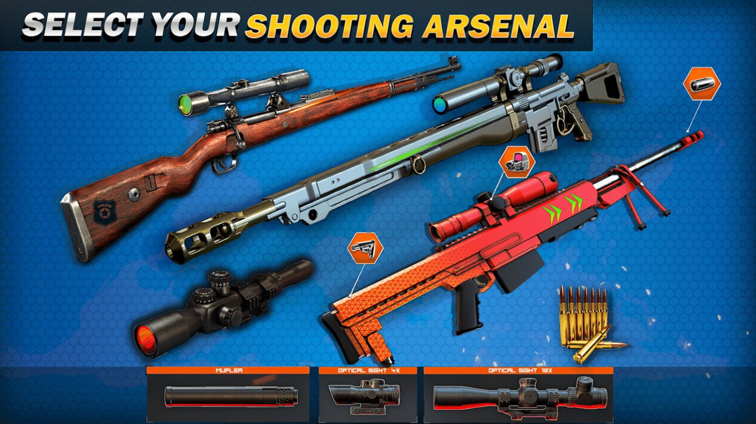2、游戏中有多种枪支弹药,你可以解锁不同的枪支来射击。
