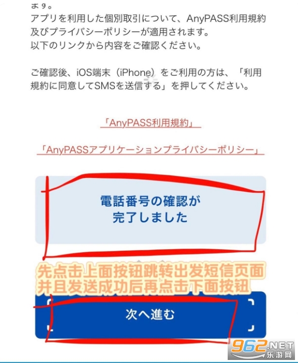 步骤②:跳转到p3页面的时候先点击上面红圈按钮,等自动跳转到p2页面发送短信之后,再回到AnyPass APP点击下面红圈按钮